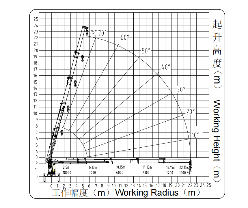 | 工作幅度 (m) | 不同臂长最大起升载荷(kg) | ||||